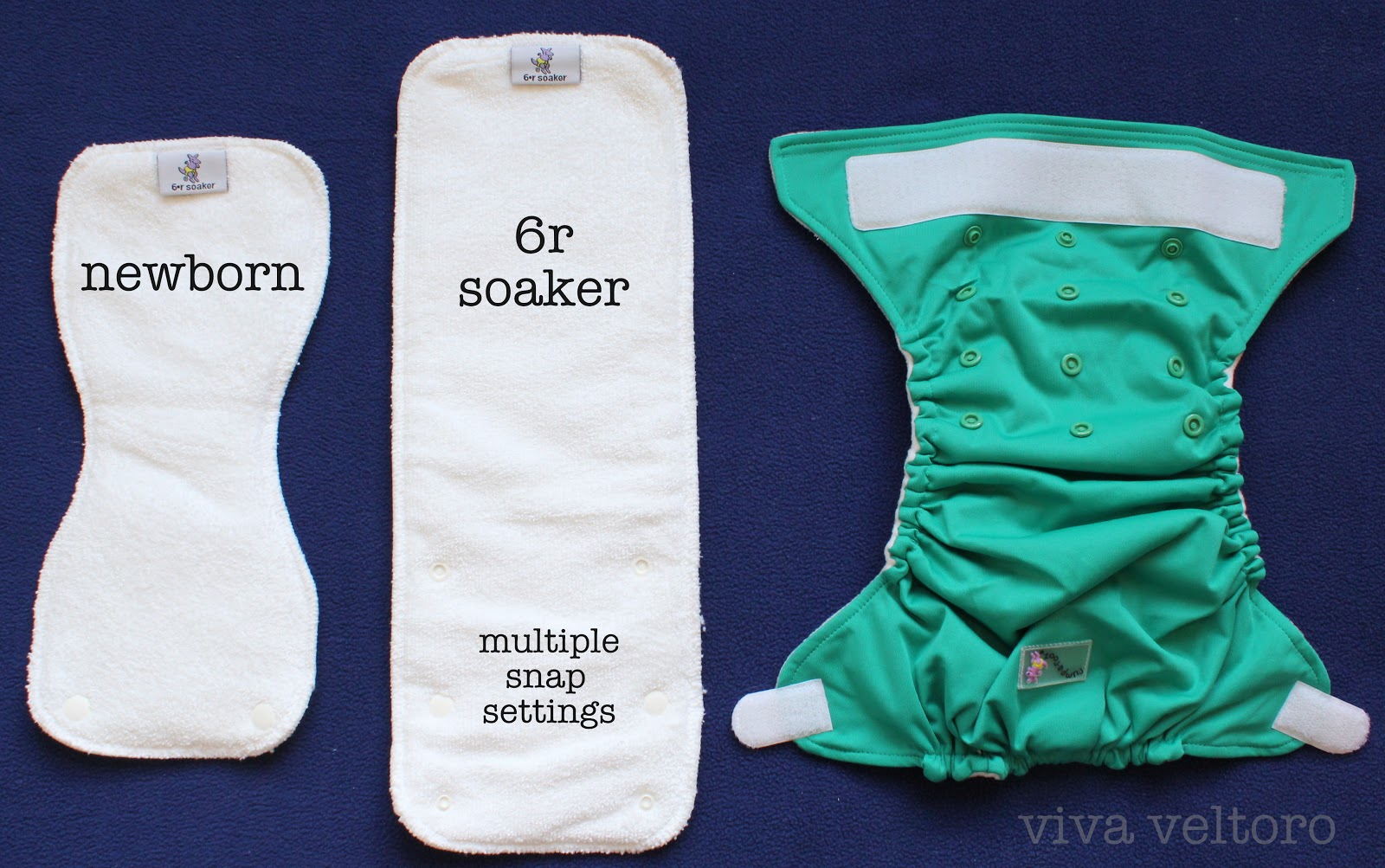 Every Rumparooz pocket diaper comes with 2 microfiber inserts/soakers which are made of 80% polyester/20%polymide. Each insert is 3 layers thick. The newborn soaker is contoured to decrease bulk between those tiny legs. It can be used alone during the newborn phase, then as a doubler by snapping it to the larger insert once baby is bigger. The 6r one-size insert has multiple snap settings so you can adjust the length based on the rise your little one is using.